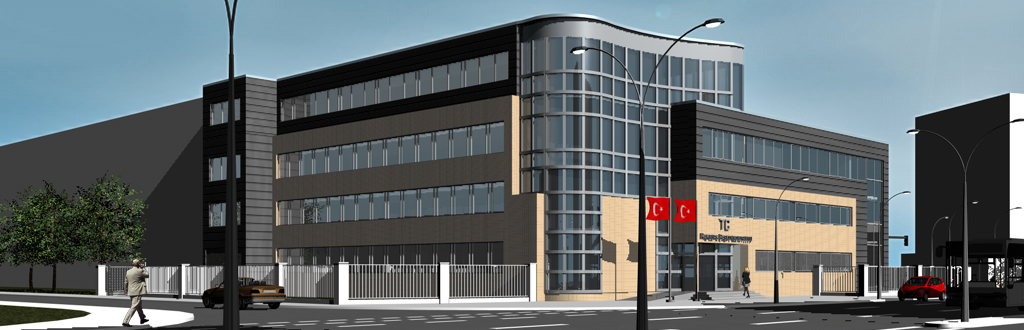 Die bestehende Polizeiwache Weidestraße in Hamburg weist infolge einer Erweiterungsstufe aus den 80er Jahren einen L-förmigen Grundriss auf. Im Zuge der bevorstehenden Umnutzung zum Türkischen Generalkonsulat werden beide Schenkel um jeweils ein Geschoss aufgestockt. Im straßenabgewandten Innenhof entsteht ein zusätzlicher Baukörper.